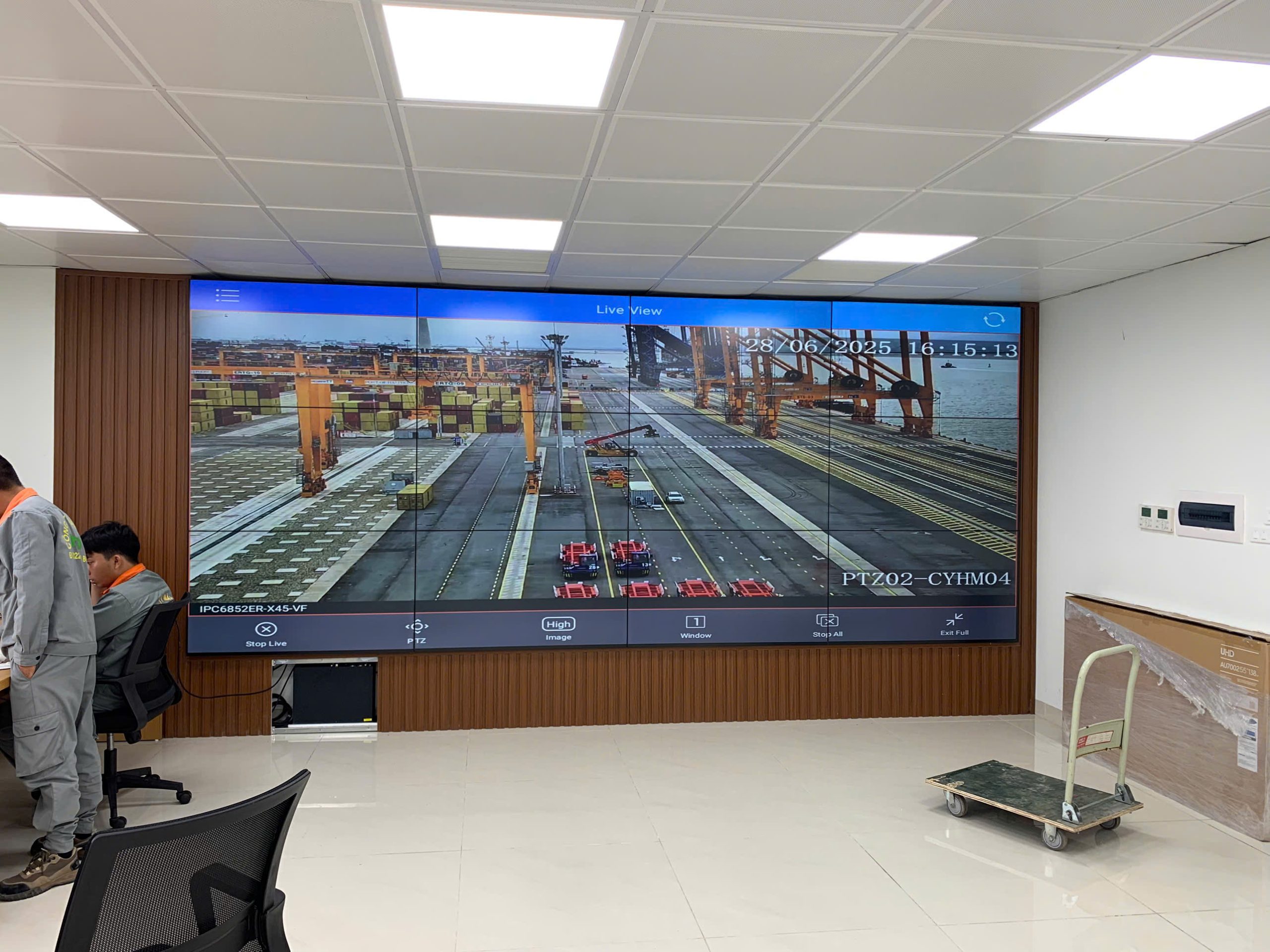Trung tâm điều hành tích hợp toàn bộ tín hiệu từ hệ thống camera giám sát, trong đó có các dòng PTZ độ phân giải cao, cung cấp góc nhìn toàn cảnh khu vực bến cảng. Màn hình ghép EWIN BT55L cho phép phóng to hình ảnh, chia kênh quan sát linh hoạt, hỗ trợ vận hành và xử lý tình huống nhanh chóng.